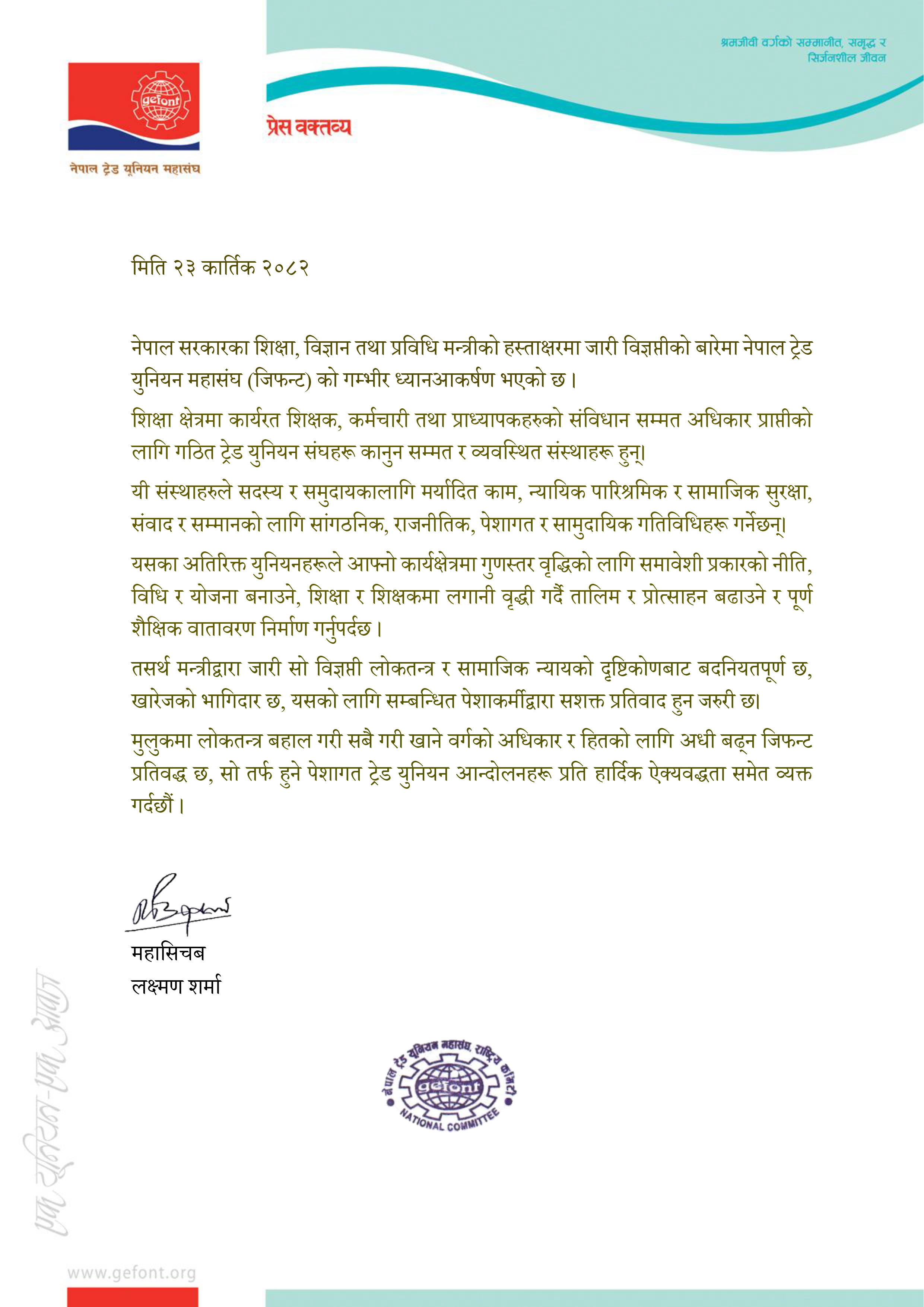 GEFONT has strongly objected to the statement issued by Education Minister Mahabir Pun, which aims to dissolve trade unions active in the education sector.