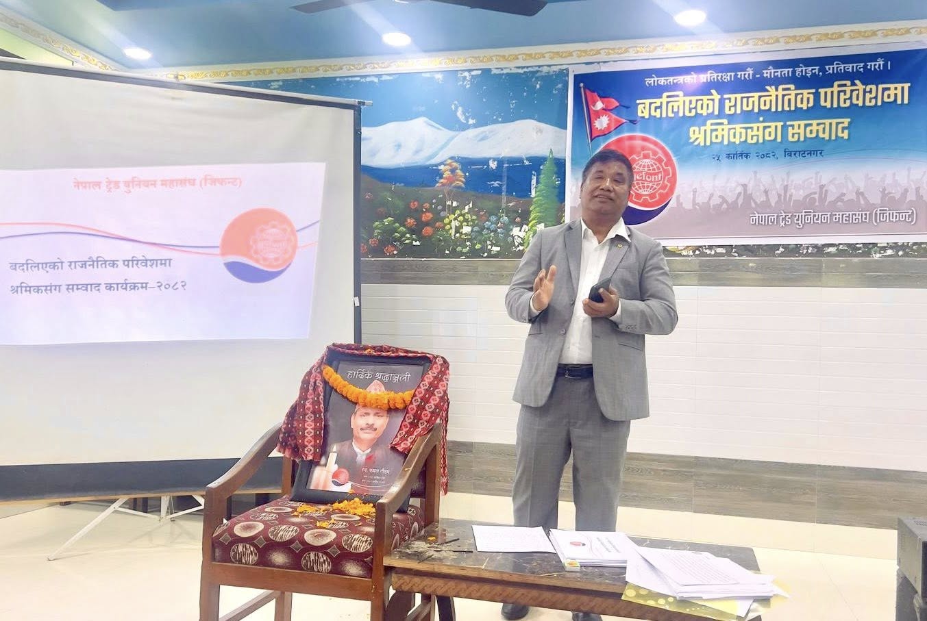 The General Federation of Nepalese Trade Unions (GEFONT) organized a Workers’ Dialogue Program on 11 November 2025 in Biratnagar amid the changing political context. The program was held with GEFONT President Binod Shrestha as the chief guest.