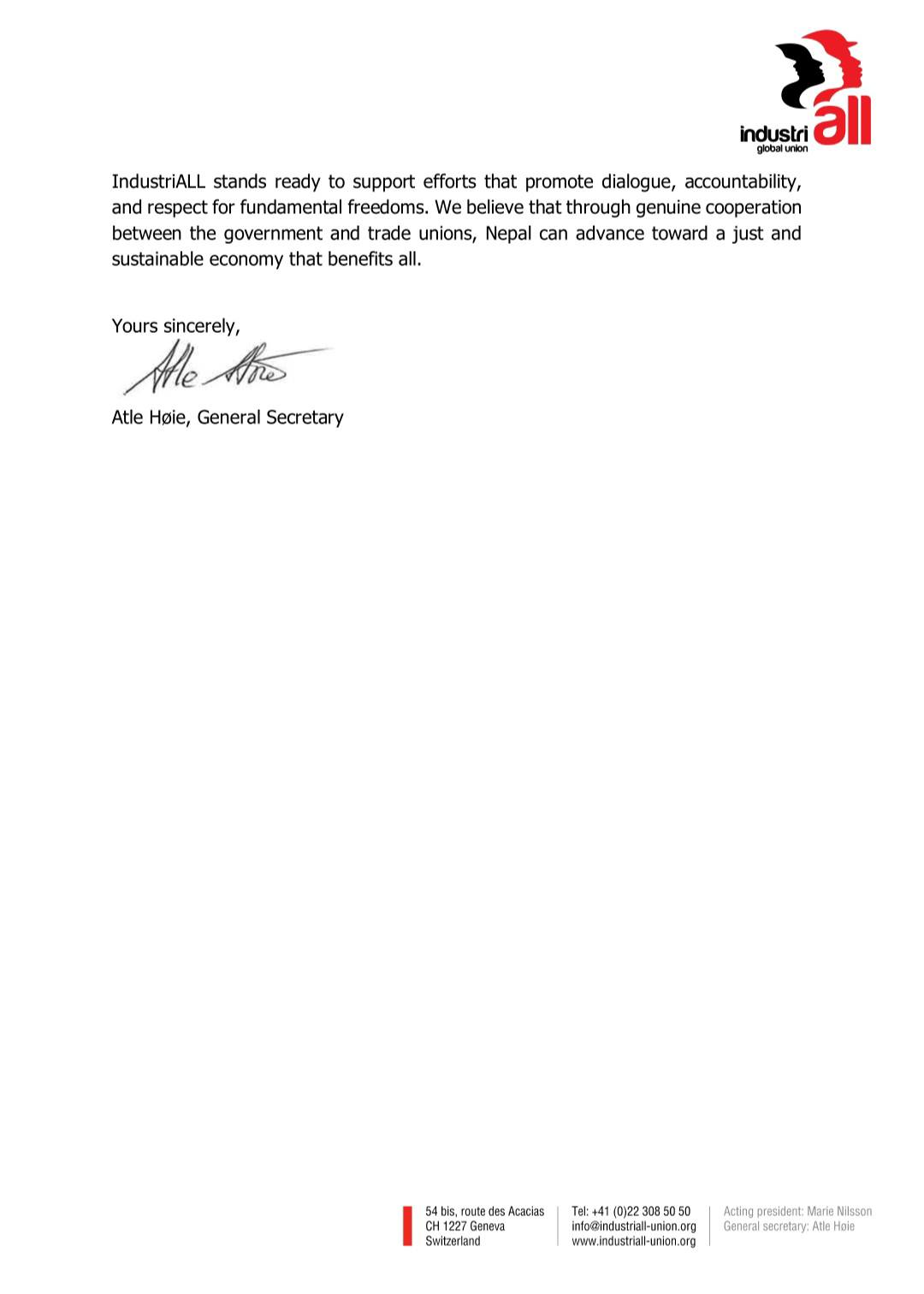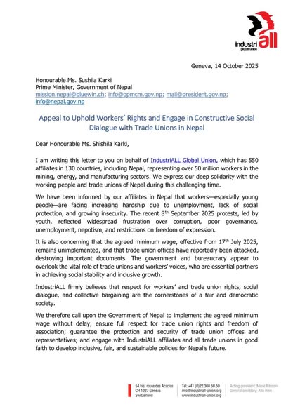 Expressing concern that the Government of Nepal is moving toward restricting trade union activities, IndustriALL Global Union Headquarters in Geneva sent a letter to Prime Minister Sushila Karki on October 14, 2025, urging the government to protect workers’ rights and engage in constructive social dialogue with trade unions.